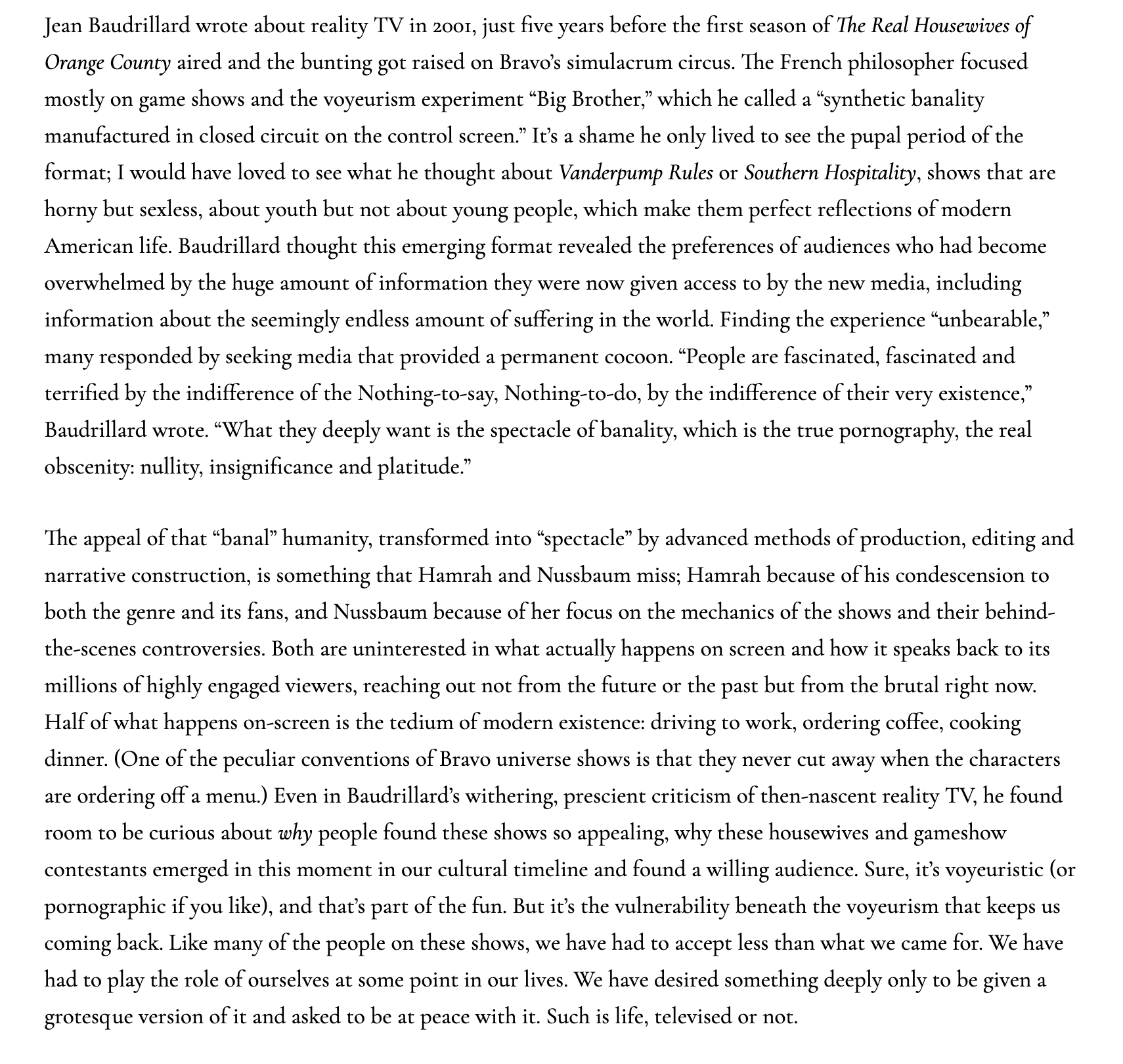, another reality TV aficionado, let me do exactly that for . It published today and you should read it and also subscribe to the magazine.I’m really happy with how the piece turned out, and much of that is due to having Jon as a collaborator through the whole process. Editors, folks, they make things better! Give it a read and tell me what you think happened between Craig and Paige and also your most deranged theory about Dorit and PK.