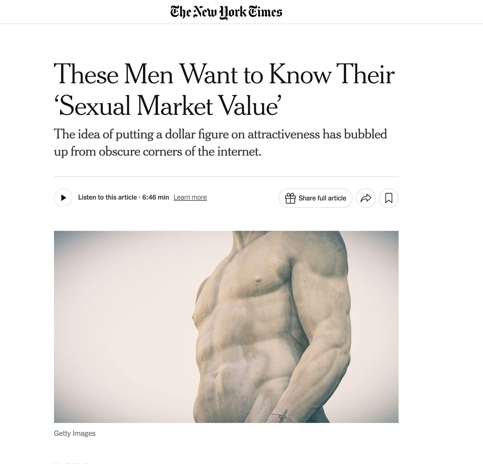 I have another piece out today that I realized explores some similar themes. It’s an investigation into the wide adoption of the term “sexual market value,” which attempts to grade men and women’s sex appeal on a scale. This backs into a topic I’ve spent quite a lot of time thinking about, in that there is this unabated march towards quantifying every aspect of our lives. Reporting this story out was depressing: there are so many sad young men out there who feel as they’re not good enough, that they need to climb some sort of ladder to be worth of love. It’s a topic I’m going to keep exploring as a writer, although one that is unfathomably sad.